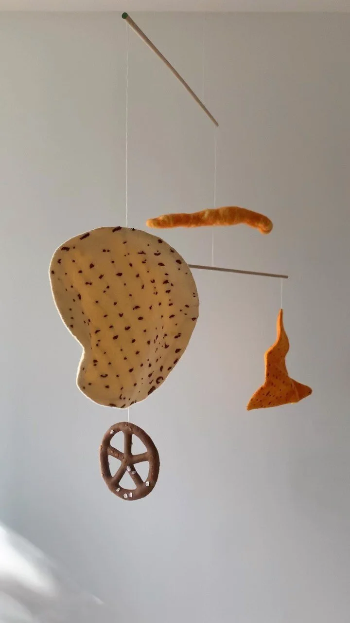 Plastic hula hoop, hardwood dowel, wool felt, cotton cloth, Mylar sheet, cotton webbing, zipper, polyester spindle cord, embroidery floss